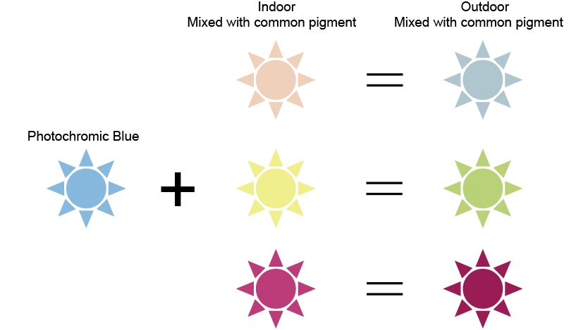 - The photochromic pigment does not react to sunlight/UV and need to be dissolved in a medium(solvent, resin, or polymer) to function. Polarity of the medium is directly related to the color.